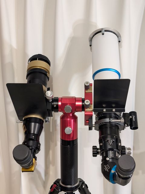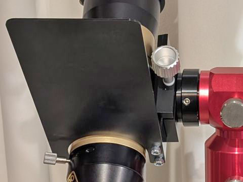 この2つの鏡筒それぞれに最近、日除け板(遮光板)を取り付けました。太陽観望される方はよく分かると思いますが、これがないとアイピースあたりに強い日差しが届いてとても見づらいです。最近販売されている太陽望遠鏡は、はじめからこれが付属しているようですが、私の機材の場合自作するしかありませんでした。